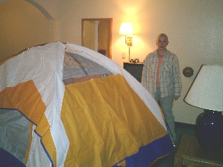 Beim Schlendern durchs Outlet greifen wir unseren gestrigen Gedanken auf, nochmals zu Zelten, und zwar im Valley of Fire. Also geht es um notwendiges Equipment einzukaufen zu einem Wal-Mart etwas außerhalb der City , weil wir hoffen, dort auch noch Filme zu kriegen. Doch leider hat dieser Walmart -im Gegensatz zum gestrigen Wal-Mart- nicht nur keine Diafilme sondern auch nicht die Schlafsäcke, die wir gesehen haben. Also nun doch zurück zu unserem ursprünglichen Laden. Im Eifer des Kaufrausches erstehen wir zwei riesige und dicke Schlafsäcke und ein hierzu passendes Zelt. Wir wollen es nun wirklich wissen, wer die bessere Ausdauer und das größere Durchhaltevermögen hat. Die harte Mutter Natur oder die Schütts. Auf dem Rückweg stärken wir uns bei KFC mit einem Honey BBQ-Burger und einem Twister. Als Generalprobe bauen wir unser neues Zelt im Motelzimmer auf. Macht einen guten und stabilen Eindruck. So, und jetzt machen wir uns fertig für die Sylvesternacht. Unser Auto wollen wir auf einem Parkplatz hinter Bally`s abstellen, mal sehen ob das alles so klappt. |