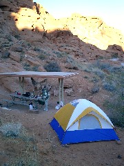 Aber jetzt zu heute. Nachdem wir doch etwas länger geschlafen haben, geht es zurück zum Valley of Fire. Auf dem Arch Rock Campground haben wir ein schönes Plätzchen für unser Zelt gefunden. Der Aufbau klappt ganz gut und unser altes Equipment findet auch noch Verwendung: So liegt die Luftmatratze die ja eh schon kaputt war, jetzt aufgeschnitten als Schutzmatte unter dem Zelt und die alten Schlafsäcke -auch aufgeschnitten- als Polsterung auf den Schaumstoffmatten. Während wir aufbauen stellen wir fest, dass es doch ganz nett wäre, wenn wir grillen könnten. Also mache ich mich -während Harry "Zeltwache" hält- auf den Weg zum Visitor Center in der Hoffnung, Grillkohle zu bekommen. Ist aber leider nicht vom Erfolg gekrönt, ich erhalte nur den Hinweis, dass die nächstgelegene Shopping-Möglichkeit in Overton ist. Zurück zum Zelt, Harry einladen und ab nach Overton. |