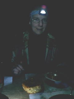Mittlerweile bricht die Nacht herein und das Essen erfolgt unter freiem Himmel im Düsteren im Licht unserer Kopflampen. Nach dem ersten Steak, das wir uns aufgrund der Größe teilen, sind wir schon satt und so gibt es das zweite dann eben morgen zum Frühstück. So jetzt geht´s ins Zelt, mal sehen wie wir die Nacht überstehen. |