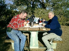 Wir erreichen unser Ziel und werden von den Möglichkeiten fast erschlagen: In einem riesigen Areal gibt es zwei Camping-Plätze, jeder mit etwa 30 Stellplätzen, alle soweit von einander entfernt und versteckt, dass man vom "Nachbarn" völlig ungestört zelten kann. Aber welcher Nachbar? Es gibt außer uns einen einzigen mit drei Amerikanern besetzten Stellplatz. Leider haben wir keine Grillkohle mehr, die letzte war beim Frühstück verbrannt, und so machen wir uns auf die Suche. Im Visitor Center verrät uns ein Zettel, dass es an einem 18Meilen entfernten Punkt Firewood gibt. Das Firewood ist unser Ziel und so steuern wir unseren treuen Wagen dort hin. Am Ziel angekommen erfahren wir, dass alles umsonst ist. Weit und breit gibt es niemanden, der uns -zumindest zu dieser Jahreszeit- Firewood verkaufen kann. Wir lassen uns nicht entmutigen, unser Essen bekommen wir auch mit dem kleinen Capingkocher heiß, wenn die Abenteuerromantik auch nicht ganz so romantisch ist wie gestern am Grill. Der traumhaftschöne Nachthimmel mit den Milliarden von Sternen, die zum Greifen nahe scheinen, lassen mich begeistert zum Himmel gucken und Harry den Verschluss seiner Kamera -trotz der Kälte- fast heiß laufen. Also dann, bis morgen! |