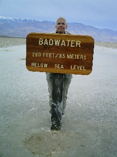 Wir erreichen laut Koordinaten des GPS die angestrebte Stelle. Die Technik zeigt an, dass wir nunmehr etwa 80Meter unter dem Meeresspiegel sind. Wir stellen fest, dass es zwischen Harry und mir ein kommunikatives Mißverständnis gibt. (Habe ich mich falsch ausgedrückt oder er nicht richtig zugehört?) Ich hatte gestern erwähnt, dass ich mir gut vorstellen könnte, dass es an der tiefsten Stelle vielleicht eine Plakette oder ä. gibt. Er wiederum verstand, dass es dort eine Plakette gibt und geistert nun verwirrt und enttäuscht mit der Kamera im Anschlag über den salzigen Boden. Mittlerweile ist es Mittag, es ist etwas wärmer geworden und wir machen uns auf den Rückweg, im Hinterkopf immer :Gott sei Dank, es ist nicht Sommer! Mittlerweile sind wir soweit entfernt von Bad Water, dass wir glücklich sind, unser GPS zu haben, das uns den Rückweg weist. Fünf Meilen Entfernung bedeutet, dass man nur noch die Gebirgszüge erkennen kann, ab kein Auto, keine Straße oder gar Personen mehr. |