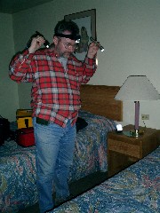Wieder in Stovepipe zurück erleben wir eine weitere Überraschung. Dunkelheit überfällt nicht nur den Nachthimmel sondern aufgrund eines Sturms auch das Innenleben unseres Motels. So etwas trifft uns ja nicht unvorbereitet und Harry läuft zur Toppform auf. Er zieht seine Batterie an Speziallampen heraus und im Schimmer unzähliger Taschenlampen, Stirnlampen und weiterer Lichter kochen wir (Süppchen im Camping-Kocher), essen wir, trinken wir und ich schreibe am Laptopp das Tagebuch. Und sollte der Stromausfall andauern, dann laden wir unser Equipment eben im Auto wieder auf! Das Abenteuer und die Romantik nimmt ein jähes Ende, als der Strom zurückkehrt und wir im "Gleiße" dunkler amerikanischer Motelbeleuchtungen wieder etwas sehen. |