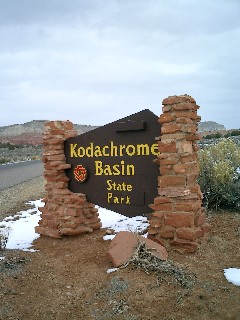 Die zwei machen sich dann doch ziemlich schnell auf den Weg. Bei uns dauert es natürlich noch was und plötzlich kommen die beiden wieder zurück. Wir erkundigen uns ob es Schwierigkeiten gibt und wir helfen können. Sie erwidern, dass sie nur ausprobiert haben, ob sie tatsächlich den Weg zurück schaffen. Jetzt möchten sie sich noch etwas umsehen. Unsere Phantasie schlägt Kapriolen. Vielleicht suchen sie ja nur ein ruhiges Plätzchen... Sie bedanken sich ausdrücklich für unsere Freundlichkeit und Hilfsbereitschaft (und Nervigkeit?). Ich glaube, wir haben ihr Bild über die Deutschen um ganz ganz viele Plätze nach oben verschoben. Wir wollen sie nicht stören, verabschieden uns "nice to meet you..." und fahren über die Cottenwood Road bis zum Kodakchromebasin. Leider ist das Wetter nicht mehr so schön. Und vom "Kodakchrome" ist nicht viel zu sehen. Wir haben es vor einigen Jahren erleben dürfen: Die Gesteine haben eine einzigartige Einfärbung, die bei kräftiger Sonneneinstrahlung vor blauem Himmel ein Farbspektrum und eine Intensität zeigen, was fast die Möglichkeiten eines guten Diafilms sprengt. Heute reicht schon fast ein Schwarz-Weiß-Film. |