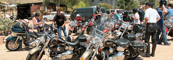 Mit großer Freude sind wir dann gegen 10Uhr doch endlich "auf der Piste". Auf der Route 66 entdecken wir bei Hackberry an einer alten Tanke, die wir bereits vor ein paar Jahren umfangreich abgelichtet haben, ein kleines Harley-Treffen. Eine organisierte Biker-Tour, die hier gerade ein kurze Pause machen um sich zu erholen. Ich betone "erholen", denn meiner Meinung nach ist Harley-Fahren nur etwas fürs Auge, andere Sinne bleiben auf der Strecke: Bei dem "Sound" der "Böcke" muss man annähernd taub sein, um Harleys zu ertragen und die Körperhaltung lassen das stundenlange Aufhängen von Gardinen als angenehme Entspannung empfinden. Aber zugegeben: Für`s Auge ist es auf jeden Fall was! |