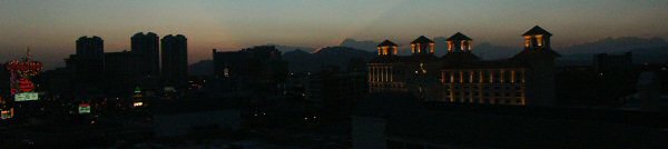 Wir fahren weiter nach Las Vegas und kommen dort gegen Nachmittag an. Am Storage (wieder mal) halten wir, um die Kisten abzuladen, die definitiv in Las Vegas bleiben. Anschließend fahren wir beim Walmart vorbei, um die Bilder ausdrucken zu lassen. Mittlerweile ist es kurz nach 8Uhr und die Bilder können daher erst am nächsten Tag abgeholt werden. Und dann passiert auch noch etwas anderes: Offensichtlich ist das Programm nur für eine bestimmte Anzahl von Bildern vorgesehen. Er zählt die Dateien auf der CD-ROM und beendet das Laden nach 400 Bildern. Die restlichen bleiben auf der Strecke. Nach diesem Zwischenfall fahren wir weiter zum Frontier und laden den Rest aus. Wir sind auf der selben Etage (10. Etage), wie vor zwei Wochen, nur einige Zimmer weiter, mit einem schönen Blick Richtung "Pool-Side". Eins haben beide Zimmer gemeinsam: Die Fenster sollten unbedingt wieder einmal geputzt werden! |