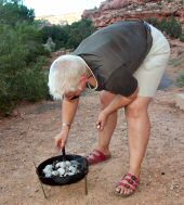 Gemütlich und mittlerweile auch erholt sitzen wir auf "unserer Site" an "unserem" Tisch und essen am Highway sitzend Beef Stroganoff und Maccaroni Cheese. Denn ganz ungestört sind wir nicht. Unsere Site nutzen eine Vielzahl von Campern u von ihrer Site zur Quelle zu gelangen um ihre Vorräte an Trinkwasser zu füllen. Sie haben offensichtlich wenig Hemmungen mitten durch unsere Site zu gehen. Wir blödeln rum, wir hätte unser Zelt am besten mitten auf den Weg gebaut, müssten dann aber befürchten, dass sie evtl. sogar durch unser Zelt klettern. Dreist ist, dass ein Wasserträger nicht nur unsere Site durchläuft sondern auch noch unsere brennende Anti-Mückenspirale platt macht. Wir bedauern dass er nicht barfuss unterwegs war... |