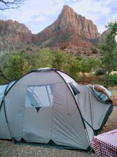 Wir erwachen wieder am Fuße eines Gebirgszuges des Zions und stellen abermals fest, dass es ein traumhaft gelegener Zeltplatz ist. Die ersten Sonnenstrahlen küssen die Zinnen des Zions.