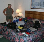 Wir haben -mittlerweile- das Zimmer 109, nachdem wir zunächst vergeblich Zimmer 124 und 140 hatten, jedoch am elektronischen Schloss verzweifelten. Offensichtlich ein elektronischer Defekt. Nachdem es dem Portier schon peinlich war, dass wir bereits zum zweiten Mal vor verschlossener Tür kapitulierten mussten, fragte ich ihn, ob er denn glaubt, noch genügend Zimmer für uns zu haben. Er erwiderte den Small Talk mit "Oh yeah, this motel has more than enough rooms also for you!" Das Chaos des Umräumens am ersten Tag hält sich heute Dank unserer ausgeklügelten Organisation und Logistik im Rahmen des Erträglichen. Nachdem wir die Taschen in der alten Welt exakt so gepackt haben, dass sich alles Equipment für die erste Trecking-Tour in einer Tasche befindet, ist die Umräumaktion schnell erledigt. Und nun legen wir uns ins Bett und freuen uns auf das bekannte "beste Frühstück der Welt" morgen früh... |