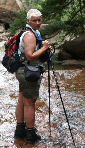 Nach den 5,5Meilen Schotterpiste durch die Wash erwarten uns nun 1,5 Meilen durch den Creek am Bach entlang. Der Weg ist links und rechts aufgrund des Baches grün bewachsen und lieblich anzusehen, wenn man durch einen Park spazieren gehen würde und nicht 35kg Gepäck auf dem Rücken schleppen müsste. Obwohl unsere Wasservorräte von Meile zu Meile an Gewicht verlieren müssten, legt uns irgendjemand großzügig Ausgleichsgewichte in den Rucksack. Die Temperaturen steigen und steigen und unsere Gesichter nehmen allmählich die rote Färbung eines Cola-Logos an. Cola, richtig, das wäre etwas!!! |