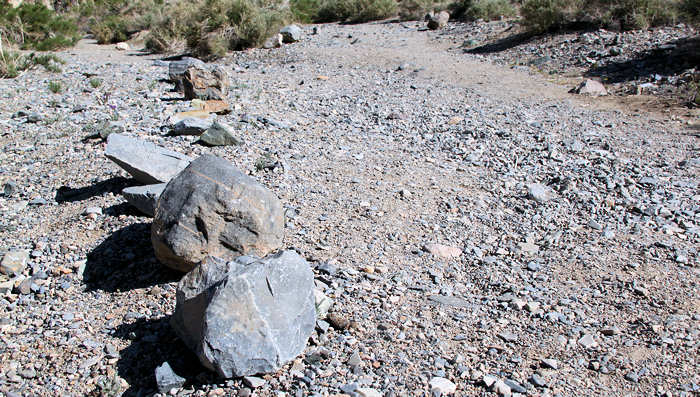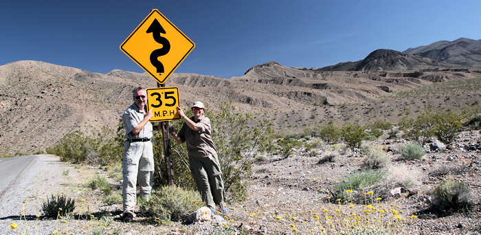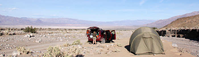 Zwar klingelt bereits um 5 Uhr wieder der Wecker, aber wir geben ihm mehrmals zu verstehen, dass wir noch nicht aufstehen wollen. Im minütigen Rhythmus erinnert er an sich und kurz vor sechs geben wir uns geschlagen und stehen auf. Heute Morgen pflegen wir uns nicht nur selbst, wie jeden Tag, sondern auch die Reißverschlüsse unseres Zeltes. Mit einem Pflegestift schmieren wir die kompletten Reißverschlüsse satt ein und ziehen die Zipper hin und her bis alles leichter läuft. Ich bin fest davon überzeugt, dass dieses Pflegemittel nichts anderes ist als ein Labello, nur als Pflegemittel für Reißverschlüsse deklariert und dafür das doppelte kostet. Anita erwidert zwar, dass vielleicht besondere Inhaltsstoffe drin sind oder eben im Vergleich zum Lippenpflegestift fehlen, aber ich bin mir da nicht sicher. Überhaupt: Im letzten Jahr habe ich beim anderen Zelt mangels Alternativen etwas Nivea-Creme genommen und das hat bis jetzt genauso funktioniert. Gut geschmiert verpacken wir das Equipment im Kofferraum und Dachsack und bereiten schon mal unsere Daypacks für die anstehende Tour vor. Wieder holpern wir den Weg in Richtung Stovepipe Wells, versorgen uns dort mit Wasser und brechen auf in Richtung Panamint, ca. 26 Meilen von Stovepipe Wells. |