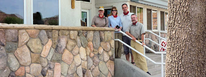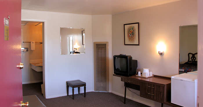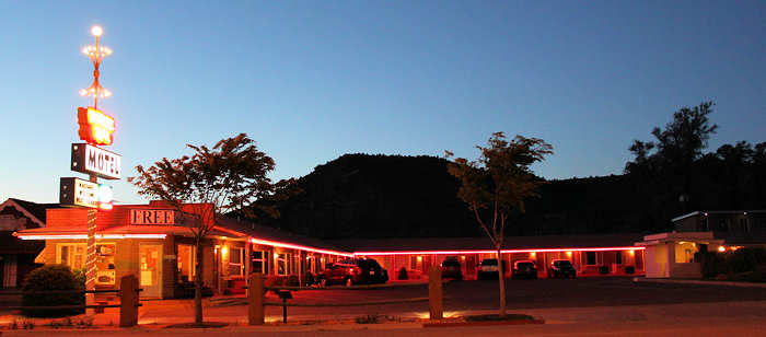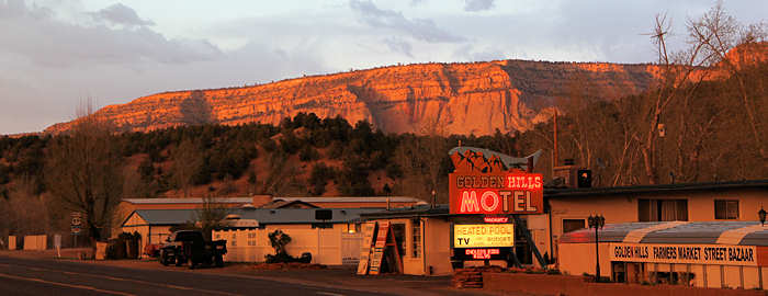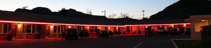 Unser erster Versuch, in Kanab ein Motelzimmer zunehmen, scheitert: Das Office der Quail Park Lodge ist zwar offen aber nicht besetzt. Statt eines Mitarbeiters liegt nur ein Zettel, dass man bei Fragen bitte folgende Tel.Nr. wählen möge. Doch wir haben kein Netz. Endlich kommt eine Amerikanerin in das Office und zuckt ziemlich überrascht zusammen, als sie uns dort verloren herumstehen sieht. Sie hat leider keine Ahnung, ob Zimmer frei sind und wenn ja, was sie kosten. Wir gehen also unverrichteter Dinge und steuern das Treasure Trail Motel an, das wir ebenfalls aus alten Zeiten gut kennen. Hier werden wir freundlich begrüßt. Gerne würden wir wieder in den alten klassischen, eingeschossigen Bau des Motels unterkommen und Anita weist geistesgegenwärtig darauf hin, dass wir sonst immer Zimmer 109 hatten. Siehe da, es ist sogar noch frei und mit meiner Nachfrage nach einer Triple-A rate werden wir uns schnell einig. |