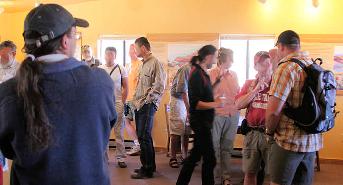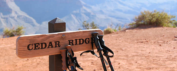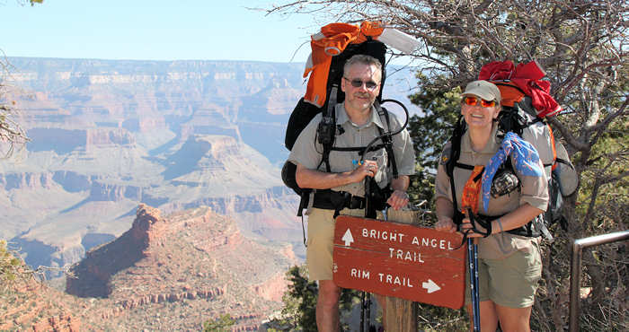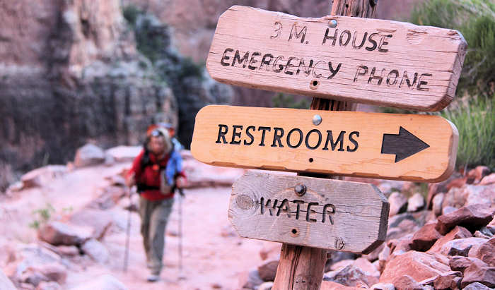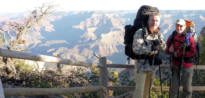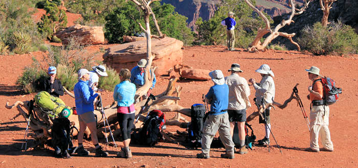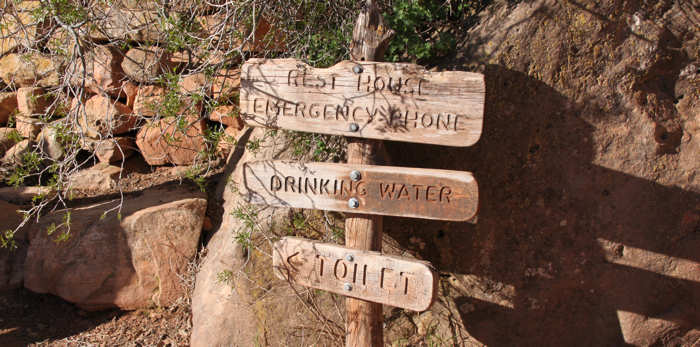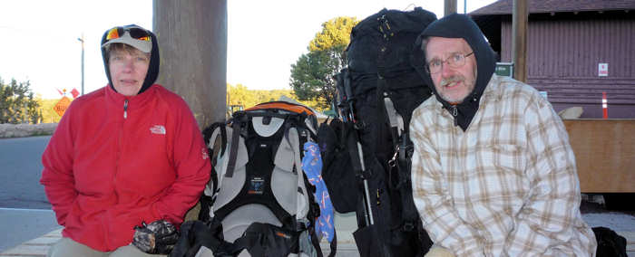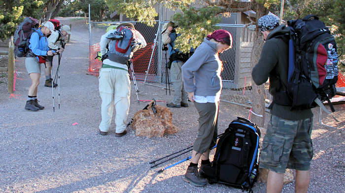Der Shuttle kommt pünktlich und hält auf seinem Weg zum Trailhead noch am Backcountry-Office und am Visitor Center und füllt sich zunehmend. Alle Hiker-Hungrigen werden dann am Trailhead zum South-Kaibab-Trail ausgeladen: Eine Horde von etwa 25 Hikern lädt die Backpacks auf, überall wird herumgefummelt: Ein Riemen wird angezogen, ein anderer gelöst, die Stöcke auf die richtige Länge ausgefahren, dann doch wieder etwas gekürzt, die Getränkeblasen mit Wasser aufgefüllt, die eigenen noch ein letztes Mal geleert. |