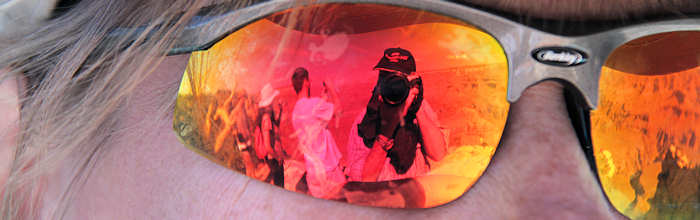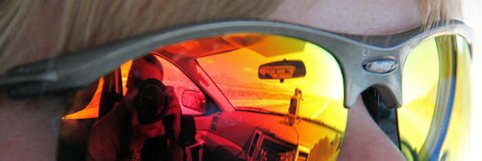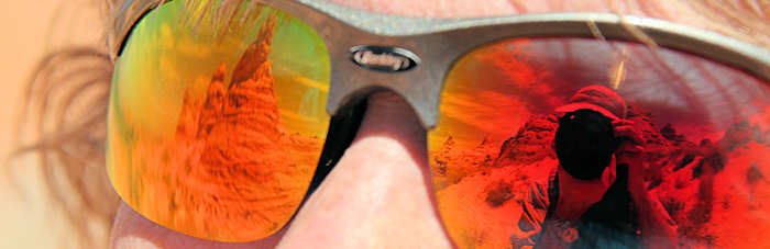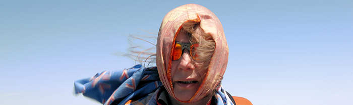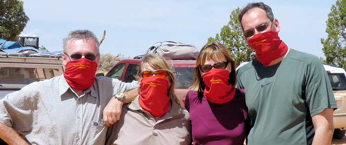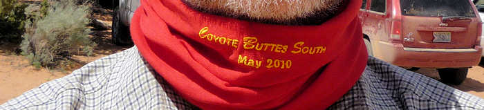 Doch mit Technik und drei Wandergefährten geht es dann wieder zurück zum Auto. Rund drei Stunden hat unser Hin und Her durch die Buttes gedauert und wenn wir uns nicht diszipliniert hätten, würden wir wohl auch heute Abend noch umherstreifen und wären dann überrascht, wenn die Sonne plötzlich untergeht. Apropos „überrascht“. Anita und ich sind auch überrascht worden und das gleich riesig: Stephi und Gunter überreichen uns Buffs mit eigens gestickten Slogan: „Coyote Buttes South May 2010“ |