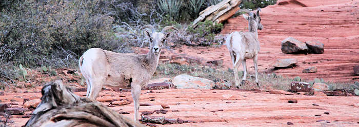 Der Fahrer erkundigt sich nach unseren Hike-Erfahrungen im Zion ist ganz platt, dass wir ja schon fast alle Trails durchhaben. Er weist uns aber noch auf seinen Lieblingstrail hin, und den kennen wir noch nicht: Es ist der West-Rim-Trail, ein 14 – 16 Meilen langer Hike, den man möglichst in zwei Tagen absolviert. Er wandert sofort auf unsere „To-Do-Liste“ und wir erkundigen uns beim ihm ausführlich über den Trail. Zurück in Deutschland werden wir uns mal genau mit dem Trail beschäftigen. Die Fahrt durch den Zion geht sehr zügig, was wohl auch an der Fahrweise von ihm liegt. Seine Geschwindigkeit ist subjektiv betrachtet deutlich über dem was erlaubt ist. Plötzlich bremst er stark, denn hinter einer Kurve stehen direkt neben der Straße Bighorn Schafe. So nahe haben wir sie noch nie hier gesehen. ein tolles Erlebnis. |