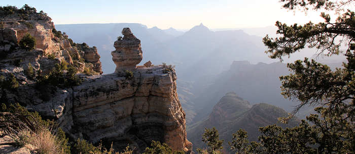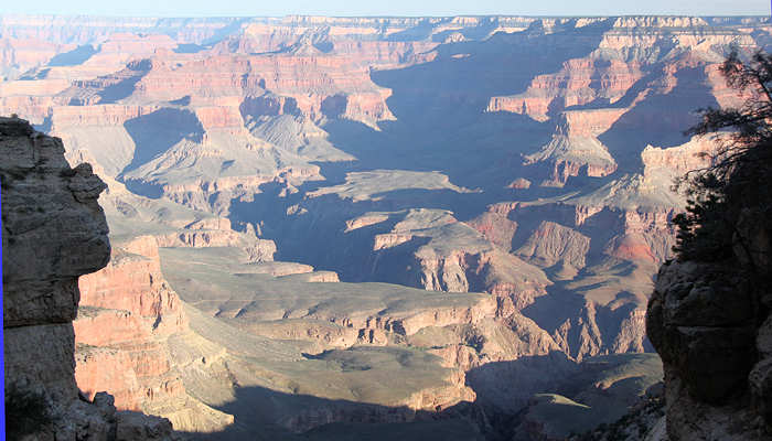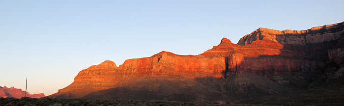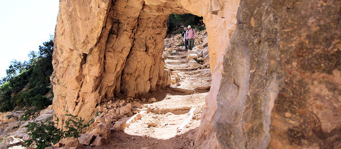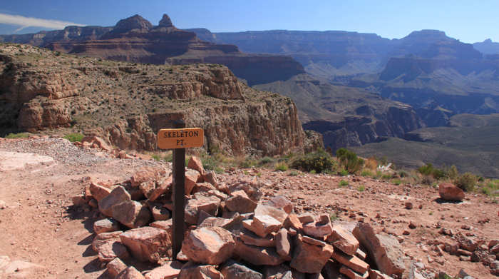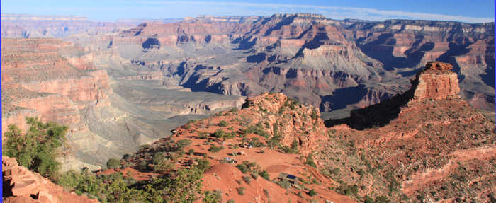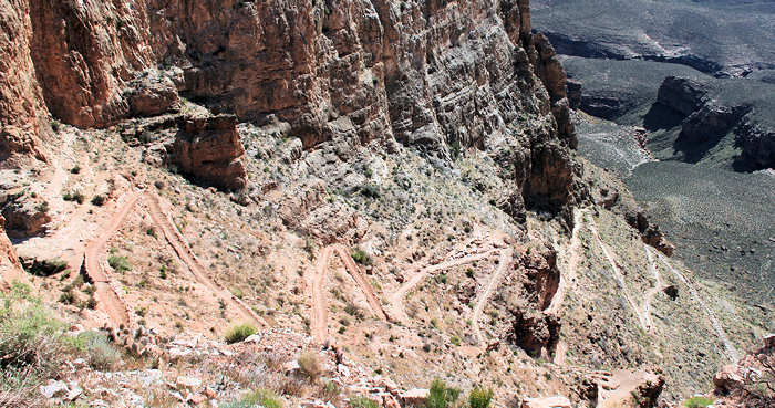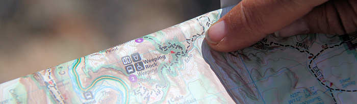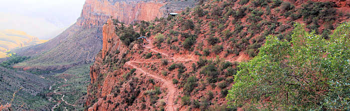 Folgende Überlegung stellen wir an: Gerne möchten wir eine zwei Tages Trekking-Tour in den Inner Canyon machen: South Kaibab Trail bis Tip Off, dort über den Tonto Trail (der für uns völlig neu ist) bis Indian Garden, dort in Indian Garden übernachten (den berühmten Sunset auf dem Plateau Point erleben) und dann am nächsten Tag wieder hoch über den Bright Angel Trail. Wir erliegen natürlich nicht der Illusion und wissen, dass es eher unwahrscheinlich ist, „just in time“ noch eine Permit für die Übernachtung im Inner Canyon zu erhalten. Alternativ können wir auch noch den Folgetag anbieten. Und wenn keine Permit zu erhalten ist, dann werden wir die einfachere Variante wählen und in einer Tagestour über den Bright Angel Trail runter und dann anschließend ( also nach dem Sonnenuntergang am Plateau Point ) im Dunkeln wieder hoch gehen. Doch wider Erwarten bejaht die Rangerin meine Frage, ob es für morgen noch eine Permit gibt und so erstrahlen unsere Gesichter. Bisher hat sich Anita immer um die Permits via Internet oder Fax gekümmert und war somit automatisch der Leader. Diesmal bin ich es. Auf die Nachfrage nach der Licenz-Plate (Kennzeichen des Wagens) stellen wir fest, dass wir es gar nicht kennen und auch nicht mehr -wie früher- auf dem Anhänger des Schlüssels steht. Also rennt Anita schnell raus. Nach ein paar Minuten ist alles erledigt und wir halten die begehrte „Lizenz zum Schlafen“ in den Händen. Anita erkundigt sich bei der Rangerin nach der Länge des Tonto Trails zwischen South Kaibab Trail und Indian Garden. Die Rangerin gibt dieses Verbindungsstück mit 1,5 Meilen an. Anita fragt nochmals nach: „Really only 1.5 Miles?“, weil sie die Tour bereits zu einem früheren Zeitpunkt schon einmal als Tagestour in Betracht gezogen hatte und damals wegen der Länge skeptisch war. Doch die Rangerin bestätigt noch einmal: „Yes, 1.5 Miles!“. Wir sind ebenso erfreut wie enttäuscht: Einerseits verkürzt das unseren morgigen Weg, andererseits ist genau das Stück, das neu für uns ist und auf das wir mit Spannung sehen, sehr kurz. Aber das hält uns natürlich nicht vom Vorhaben ab. Anita ist dennoch sehr überrascht und versteht die Angabe nicht, weil sie die Länge ganz anders in Erinnerung hat. Leider lässt sich auf der Karte, die man am Eingang zum Grand Canyon ausgehändigt bekommt, aufgrund der groben Skalierung die Länge nicht einschätzen. Und vernünftiges topografisches Kartenmaterial haben wir nicht dabei, weil wir uns für diese Tour ja sehr spontan entschieden haben. Jetzt kommt uns dir Idee, dass wir ja bei der Durchfahrt durch Vegas kurz am Storage hätten anhalten können um die entsprechenden Karten aufzupicken. Also werden wir nachher wohl eine Karte im General Store erwerben müssen, denn ohne Kartenmaterial gehen wir nach leidvollen Erfahrungen in der Vergangenheit nicht mehr durch für uns unbekanntes Gebiet, auch wenn es im Grand Canyon ist, wo die Trails in der Regel gut ausgeschildert sind. |
