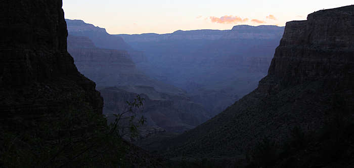 Nach all diesen schwierigen Entscheidungen geht es zum Market Plaza und zum Canyon Cafe zum Abendessen. Für gewöhnlich esse ich hier immer meine Chicken. Und obwohl sie beim letzten Mal eher „suboptimal“ waren, gebe ich den Hühnern nochmals eine Chance und werde nicht enttäuscht. Anita entscheidet sich für eine vegtarian Chili in einer Brottasse. Danach geht es zum begehrten Shoppen, habe ich doch hier im letzten Jahr eine gute Zipphose zum akzeptablen Preis gefunden. Doch heute gehe ich leer aus. Mittlerweile trage ich schlankere Kleidergrößen und die werden hier nicht geführt. Auch Anita findet nichts. Während ich mich noch durch die Kleiderstangen kämpfe auf der Suche nach einer vergessenen Hose in der passenden Kleidergröße in der verstecktesten Ecke, kommt mir Anita mit der Topo Karte in der Hand aufgebracht entgegen: Die Aussage der Rangerin, der Streckenabschnitt des Tonto Trails sei 1,5 Meilen ist falsch, wie sie eben festgestellt hat. Sie appelliert an ihr gutes Gedächtnis und zeigt mir auf dem Plan, dass die Strecke 4,5 Meilen lang ist, also fast dreimal so lang! Es hätte mich auch gewundert, wenn sich eine Rangerin im Grand Canyon besser auskennt als Anita ;-) Morgen früh soll uns ein Shuttle von der Bright Angel Lodge zum Trailhead vom South Kaibab Trail transportieren. Selbst darf man dorthin schon seit einigen Jahren nicht mehr fahren. Aber selbst wenn es erlaubt wäre, würde uns das nichts nützen, denn wir werden ja über den Bright Angel Trail aus dem Canyon rauswandern und stünden dann hier ohne Auto. Da sich die Shuttle-Station geändert hat fahren wir vorsichtshalber schon mal dort hin um die Lage zu sondieren und morgen früh nicht erst noch suchen zu müssen. Wir stehen an der Station am Bright Angel Lodge, von wo aus auch der Village Shuttle abfährt. Wir können an den Schildern nicht ausmachen, ob auch unser morgiger Hiker Express Shuttle dort hält. Eine Amerikanerin bemerkt unsere suchenden Blicke und fragt, ob sie helfen kann. Doch auch sie kennt die richtige Station nicht und spricht einen Mitarbeiter des Grand Canyons an, der uns verkündet, dass der Shuttle nicht hier halten wird sondern unmittelbar vor der Lodge in einiger Entfernung. Wir bedanken uns für die Freundlichkeit und Hilfsbereitschaft, sind aber etwas skeptisch und lesen noch einmal die Beschreibung in der Backcountry Permit durch. Die wiederum würden wir so interpretieren, dass der Shuttle doch hier halten wird. Wir teilen uns auf: Während Anita in die Lodge geht, halte ich in zweiter Reihe Wache über den Wagen. Noch bevor ich einen ordentlichen Parkplatz ergattere kommt sie schon wieder schmunzelnd zurück: Der Shuttle hält an der Busstation, also dort, wo wir eben gesucht hatten... Es gibt um 5 Uhr einen, um 6Uhr und den letzten um 7Uhr. Danach kommt man nur noch etwas umständlicher mit den regulären Shuttles zum Trailhead. Wir entscheiden uns für den mittleren Shuttle um 6Uhr. Zurück auf der Campsite geht es nur noch in die Schlafsäcke, denn die Nacht wird bald vorbei sein. |