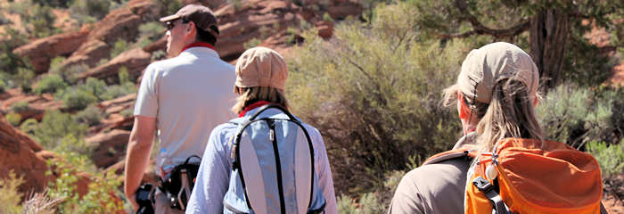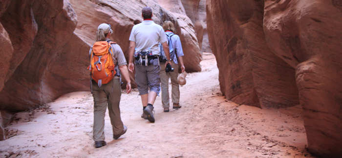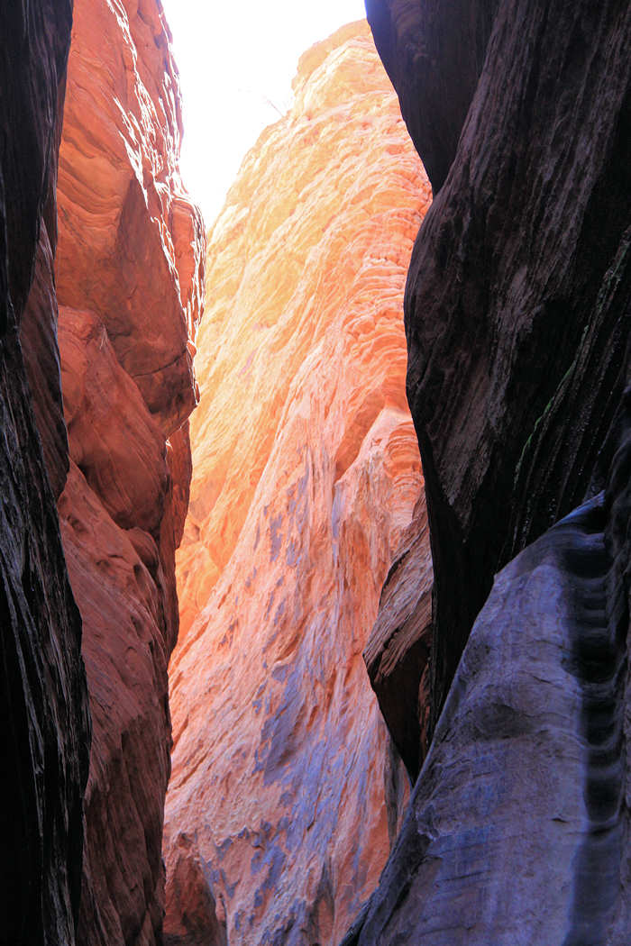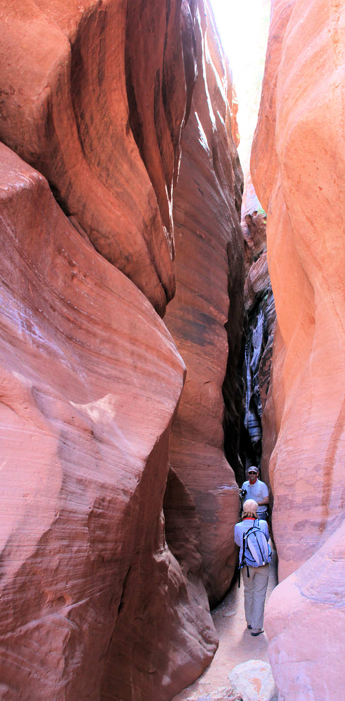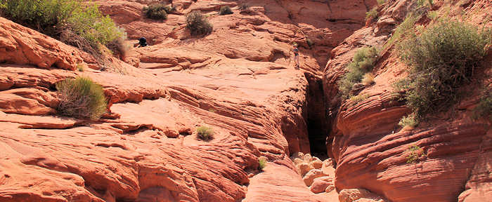 Es geht weiter die Wash entlang bis sich die Felsen vor uns so verengen, dass sie einen länglicher Schlitz bilden, der einem Höhleneingang gleicht. Hier startet der schönste und aufregendste Teil unserer heutigen Wanderung. Die Felsen sind an einigen Stellen so eng, dass wir zu breit sind um durchzukommen und so müssen wir uns quer durchschlängeln. | |