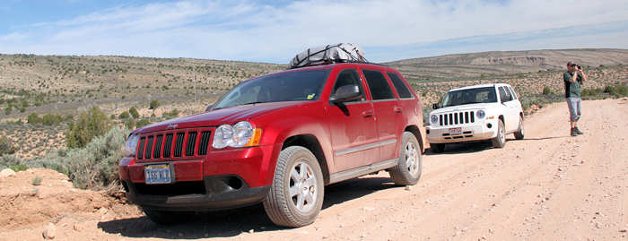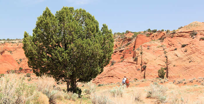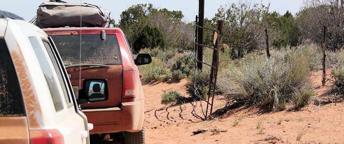 Heute steht für uns der Hike vom Wire Pass zum Buckskin Gulch an. Das erste Stück vom Wire Pass bis zum Confluence mit dem Buckskin Gulch ist uns beiden bereits gut bekannt, weil wir es schon mehrmals gelaufen sind. Das Stück von der Confluence bis zum Trailhead des Buckskin Gulch hingegen kennen wir nicht: Unsere fünftägige “Wet Wild West-Tour“ haben wir 2008 bewusst vom Wire Pass aus gestartet, da die erste Tagesetappe bis zur ersten Flashfloodsicheren Campmöglichkeit sonst auf 17 Meilen angewachsen wäre, was uns mit 20kg Gepäck auf dem Rücken zu viel erschien. Es bietet sich auch hier an, mit zwei Wagen zu fahren, um sich damit den Rückweg über die Houserock-Valley-Road (ca. 4 Meilen) zu sparen. Also verfahren wir wie folgt: Mit beiden Jeeps befahren wir die Houserock-Valley-Road und lassen unseren Wagen am Buckskin Gulch Trailhead stehen. Alle vier fahren dann mit Gunters Auto zum Wire Pass-Trailhead, von wo aus wir starten. |