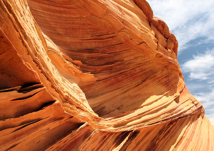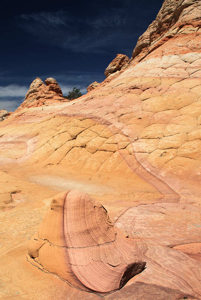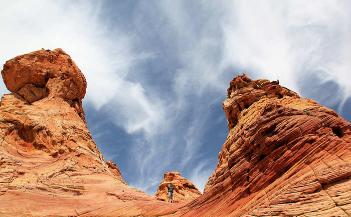 Die ersten 300 Meter kennt jeder, der schon mal zur Wave gegangen ist. Es geht vom Trail aus die Wash entlang. Wir verlassen sie jedoch diesmal nicht sondern folgen ihr bis sie sich verengt und auf der rechten Seite erste Felsen auftauchen, ein idealer Ort, um im Sommer etwas Schatten zu erhaschen. (Wir wissen, wovon von wir sprechen) | |