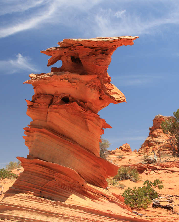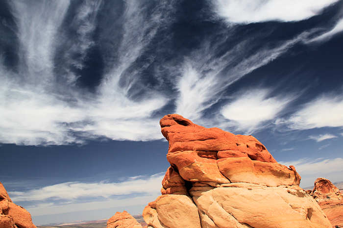 Nach etwa einer Meile erreichen wir die Buttes und zunächst durchstöbern wir jeden Felsen, der Surrealität dieses Gebietes erlegen. Wir fotografieren, was das Zeug hält. Zumindest meine Kamera startet durch. | |