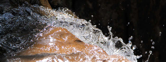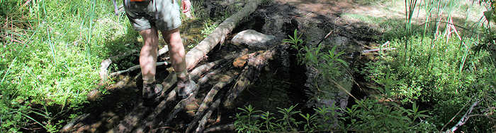 Mehrmals müssen wir einen kleinen Wasserlauf überqueren, der aber nur 2 bis 3 Meter breit ist und durch quergelegte Stämme und Äste gut und trockenen Fusses zu überqueren ist. Nach fast genau einer Meile heißt es etwas zu klettern, wobei diese kleinen Felsen kein wirkliches Hindernis sind. Die Stufen sind gut zu meistern, dennoch heißt es „Vorsicht walten zu lassen“, denn der Fels ist spiegelglatt. Obwohl unsere Schuhe erfahrungsgemäß eine gute Traktion haben, rutschen wir an mehreren Stellen sogar auf trockenem Fels ab. Keine wirkliche Gefahr, allenfalls landet man im Wasser. Nach genau einer Meile stehen wir dem Wasserfall gegenüber und wir sehen uns ziemlich verdattert an. Der Wasserfall entpuppt sich als ein kleines Gerinnsel, das irgendwo aus dem Dickicht kommt. Es ist kaum etwas zu sehen, weil alles zugewachsen ist. Dennoch ist es eine gute Gelegenheit, eine kurze Pause zu machen und den Miniatur-Wasserfall in Großaufnahme zu fotografieren. |