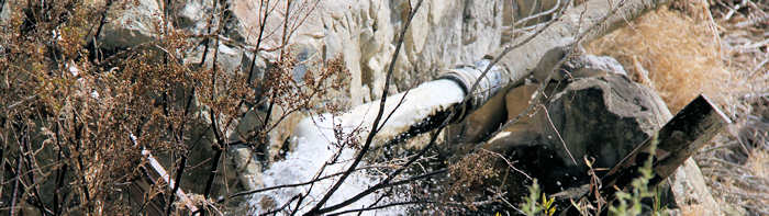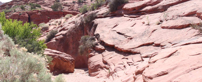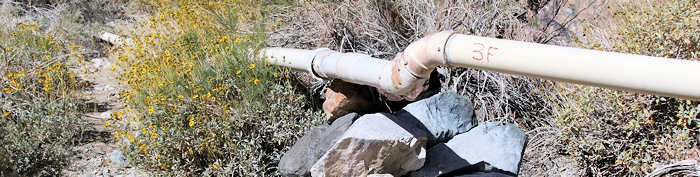 Der Weg verläuft teilweise in einer Wash innerhalb eines großen und breiten Canyons. Das erste Wasserrauschen, das wir nach etwa 500 Meter registrieren, entstammt nicht dem gesuchten Wasserfall, sondern entpuppt sich als ein geborstenes Rohr.