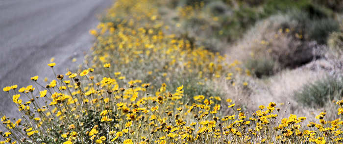 Nach gut einer Stunde ist alles erledigt: Das Fleisch gegessen, der Grill gesäubert und der Abfall ordnungsgemäß wieder eingepackt. Vom Wildrose-Campground geht es rund 50 Meilen nach Furnace Creek. Wir sind mal wieder genau zur richtigen Jahreszeit hier, denn im Moment ist die kurze Zeit des Bloomings. Das heißt, dass die Wüste für wenige Tage anfängt zu blühen... |