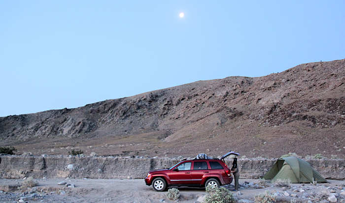 Um 5.00 Uhr klingelt der Wecker. Es ist aber noch so stockdüster, dass wir noch nicht aufstehen müssen. Denn ich möchte das Stück durch die Wash zumindest mit etwas Licht fahren, um nicht unnötig wegen eines übersehenen Felsens aufzusetzen. Um 5.30 Uhr stehen wir dann tatsächlich auf und nach einer eher spartanischen Wäsche (so gut das eben in der Wildnis möglich ist) hoppeln wir wieder zurück in Richtung Stovepipe Wells. |