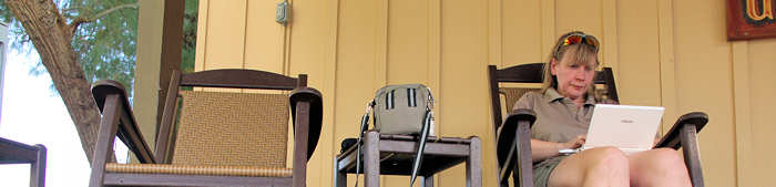Übrigens schaffen wir es auch, „unsere Bank“ zu belagern, wenn es jetzt auch zwei Schaukelstühle mit Tisch sind. Allmählich fängt es an zu dämmern und meine Hoffnung schwindet, noch im Hellen den Weg durch die Wash zu unserem Zelt zu fahren. |