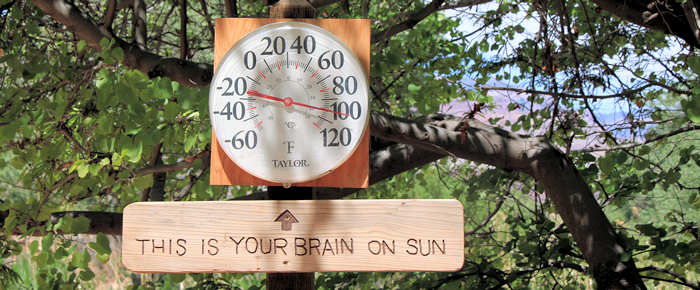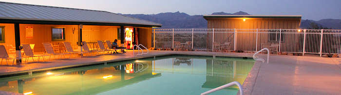 Zurück im Zimmer gibt es eine Stulle, etwas Fernsehen und dann geht es schon zum abendlichen Pooling: D.h. diesmal beschränken wir uns darauf, am Pool zu legen und den Kaffee aus dem General Store zu genießen. Das Schwimmen ersparen wir uns, denn obwohl es zum Rumliegen gerade noch angenehm ist, wäre es zum Schwimmen eindeutig zu kalt. Interessiert beobachte ich das Thermometer am Pool, es zeigt nur ca. 4 Grad Fahrenheit weniger an als heute Nachmittag. Doch die intensiv brennende Sonne fehlt und so empfinden wir die Temperatur deutlich niedriger. |