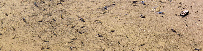 Weiter geht es über Stovepipe Wells zu Salt Creek, um mal wieder nach den Pubfischen zu sehen. Die Pubfische sind nur eine kurze Zeit während des Jahres hier, wenn der Salt Creek für eine kurze Zeit Wasser führt. Die Salzkonzentration ist um ein vielfaches höher als in den Meeren und diese Fischart hat sich auf eine beeindruckende Art dem widrigen Biotop angepasst. Ich hingegen habe mich nicht angepasst und so werde ich Opfer riesiger Bremsen, die sich gezielt auf mich stürzen. Anita hingegen bleibt unangetastet. Unser Ausflug über die Stege des Salt Creeks gestaltet sich daher kurz und reduziert sich auf wenige Fotos unter widrigsten Bedingungen. |