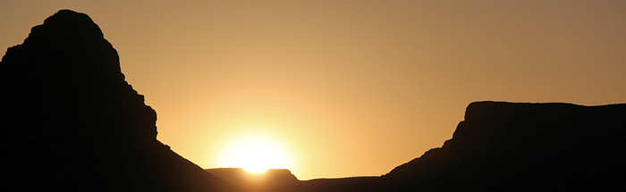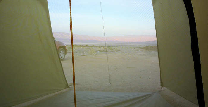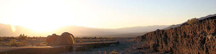Schon bald geht es in die Schlafsäcke. Im Zelt ist es mit 29 Grad sehr warm, so dass wir sämtliche Lüfter und Eingänge auf Durchzug stellen. Langsam wird es dunkel und es kehrt eine unbeschreibbare Stille ein. Man hört nichts. Es ist so leise, dass es in den Ohren schon unangenehm dumpf ist. Durch die einbrechende Dunkelheit zeichnen sich in gut 12 km Entfernung die Lichter von Stovepipe Wells ab. Wir haben das Zelt genau so positioniert, dass wir in (besser gesagt: AUF) den Schlafsäcken liegend die blinkenden Lichter von Stovepipe Wells und die glühenden Berge des Canyons sehen können. Und mit diesen Eindrücken schlafen wir auch ganz schnell ein. Gute Nacht! |
