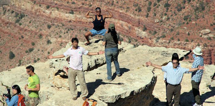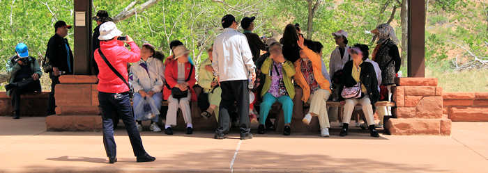Ich bin sprach- und fassungslos. Sie verabschiedet sich freundlich und bedankt sich. Erst jetzt reagiere ich und bedaure, dass ich sie nicht als Beweis für diese Dreistigkeit um ein Gegenfoto gebeten habe. Denn ich bin mir sicher, wenn ich das Zuhause erzähle, glaubt mir das doch keiner. Mit dem nächsten Shuttle fahren wir in Richtung Visitor Center. Auf der anderen Seite der Straße sitzt eine Reisegruppe von Japanern, zu der auch „unsere Japanerin“ gehört. So freundlich und zurückhaltend Asiaten im Einzelnen sind, so laut sind sie aber auch im Rudel. Die gegenüberliegende Busstation steht komplett unter japanischer Herrschaft und wir sind froh, in die Gegenrichtung zu müssen. |