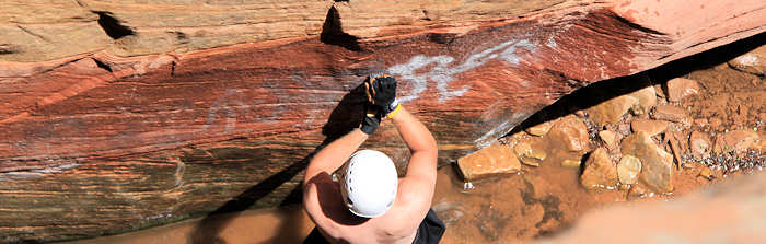 mit viel Anstrengung bemüht, ein Grafity(!) von einer Felswand zu