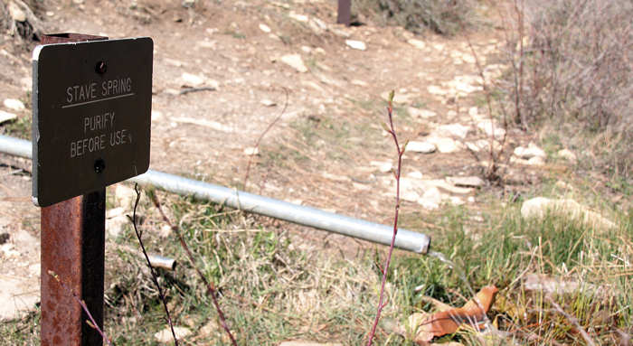 Bei Stave Spring begegnen wir dem Paar wieder. Sie sonnen sich auf einer Wiese. Wir lassen die Quelle hingegen links liegen und gehen durch bis wir nach 5,8 Meilen Gesamtsrecke die Weggabelung zu Deertrap und Cable Mountain treffen, und dort in der Nähe pausieren. | |