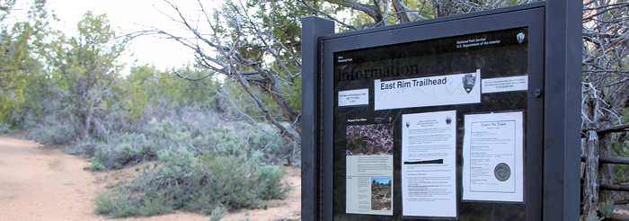 Nach einer halben Stunde Fahrt entlässt er uns am Trailhead und wir starten mit dem zehn Meilen langen East Rim Trail-Hike. Im Moment ist es nicht nur frisch sondern sogar ausgesprochen kalt. Der Himmel ist völlig klar und es scheint einen tollen Tag zu geben aber jetzt nützt uns das wenig. Wie gesagt: Es ist eisig kalt. Trotz unseres bewährten Zwiebellooks müssen wir zügig gehen, um langsam Betriebstemperatur zu erreichen. Der Fahrer hatte noch erzählt, dass ein kalter und langer Winter hinter ihnen liegt. So wurden 250% Regen und 150%Schnee im Vergleich zu den Vorjahren gemessen. |