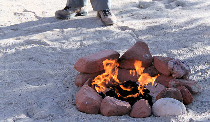 Mit vielen Fragezeichen im Kopf geht es zurück zur Campsite, wo wir ein Lagerfeuer anwerfen. Es ist ziemlich frisch. Man merkt, dass die Sonne Ende April schon viel Kraft hat. Ist man ihr ausgesetzt, brennt sie sogar ein wenig und erwärmt uns. Jetzt, wo sie verschwindet, wird es merklich kühl. Sehr bald verschwinden wir in den dicken Schlafsäcken und nach etwas Bibbern schlafen wir auch schnell ein. Wir verlegen die Entscheidung, wie es weitergeht, auf morgen. |