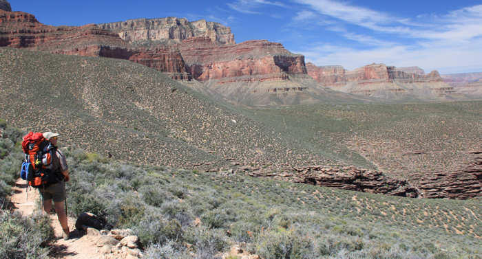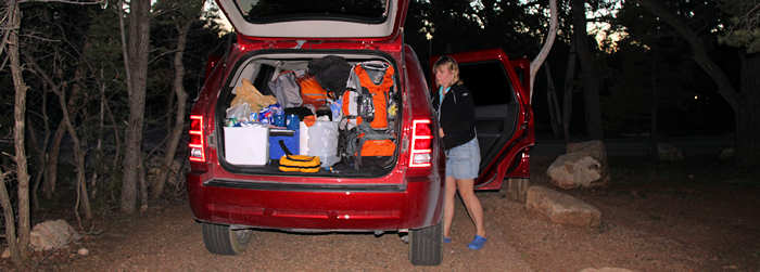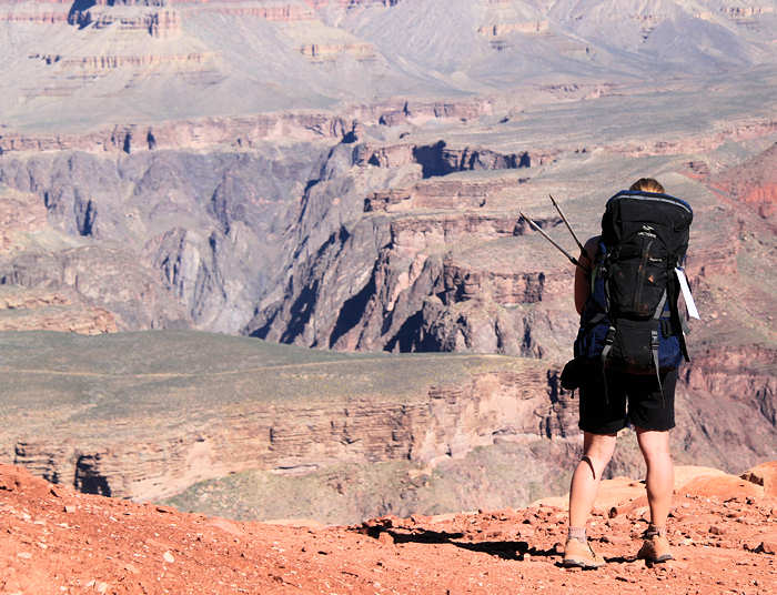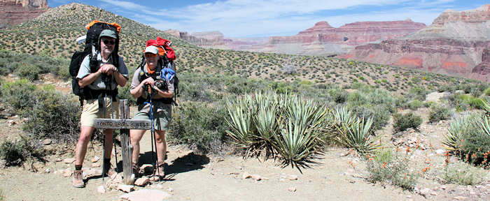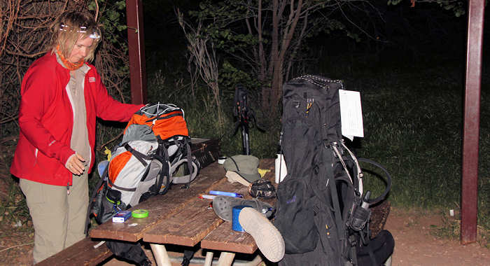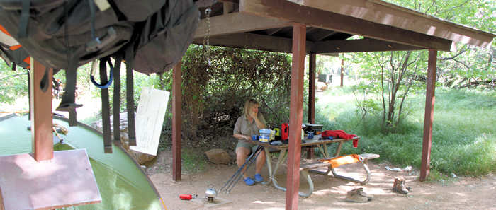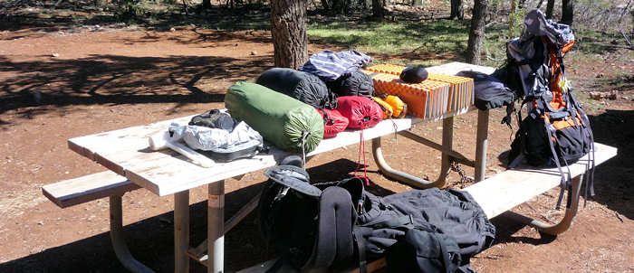 Um so überraschter sind wir als wir mit der Site 107 ohne es zu wissen mal wieder einen Glücksgriff getätigt haben: Sie ist die erste Site auf der Juniper Loop liegt zwar mit einer Seite auf dem Hauptweg , ist aber dennoch richtig ruhig und schön groß. Mit „SCHÖN GROß“ meinen wir, dass man zum Nachbarn einen angenehmen Abstand hat, ohne dass er einem gleich in den Kochtopf schauen kann. Das Zelt bauen wir schnell und routiniert auf. Überhaupt vergeht mittlerweile fast mehr Zeit damit, die geeignete Stelle zu finden (Boden soll eben sein, möglichst keine spitzen oder scharfen Steine, er muss für unser Zelt groß genug sein) als mit dem eigentlichen Aufbau. Zumindest nach unserer Einschätzung, vielleicht sollten wir die Zeit mal stoppen. Nach der Ortsbestimmung, der Ausnordung und dem Aufbau geht es zum Rucksackpacken. Das ist leichter gesagt als getan, weil eben alles Equipment gut verstaut sein will, über jedes Einzelteil nachzudenken ist ob es auf der Tour wirklich benötigt wird. Denn jedes unnütze Teil hat auch sein Gewicht. Hier sind oft schwere und ggf. auch weitreichende Entscheidungen zu fällen. Wir entscheiden uns, möglichst wenig mitzunehmen, d.h. auch, dass wir beim Outfit auf die Wechselkleidung verzichten. Es wird schon gut gehen! Beim Wasser entscheiden wir uns für 3 Liter pro Person, wohl wissentlich, dass wir erst am Ende der Etappe in Indian Garden wieder Wasser haben werden. |
