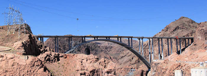 Aber kommen wir zurück auf den Hoover Dam. Seit Jahren beobachten wir den Ausbau der Umgehungsstrecke un heute sehen wir die beeindruckende Brücke das erste Mal mit dem geschlossenen Bogen. | |