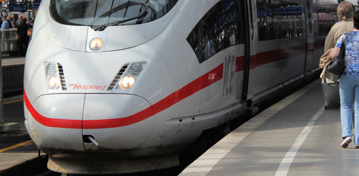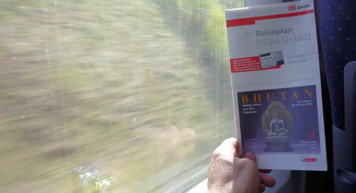 Wir haben noch Zeit bis unser Zug fährt und so folgt dem ersten Frappe ein zweiter. Irgendwann ist dann doch mal Schluss und wir gehen mit unserem Koffer in Richtung Bahnsteig. Ich betone „mit unserem Koffer“, denn tatsächlich haben wir es auf unserer 35. Tour doch mal geschafft, nur mit einem Koffer zu reisen und der hat gewichtsmäßig sogar noch etwas Luft. Oben auf dem Bahnsteig verschlägt es uns für einen Moment die Sprache. Soeben verlässt ein ICE in Richtung Frankfurt den Bahnhof mit 2 Stunden Verspätung. Bedeutet das etwa, dass alle IC in diese Richtung eine solche Verspätung haben werden? Ein Blick auf die Fahrtanzeige lässt uns etwas aufatmen. Der Folgezug hat „nur“ zehn Minuten Verspätung. Doch bevor unser Zug eintrifft gehe ich noch in Richtung Automaten, um noch ein Getränk für die unendlich weite Reise nach Frankfurt zu ziehen. Ich kämpfe mit meinen Geldscheinen am Automaten, da fährt doch schon tatsächlich unser Zug ein, verfrüht! Somit heißt es umkehren und ich renne zu Anita, die bereits alles Gepäck aufgenommen hat und wie ein Sherpa vor dem Zug steht.