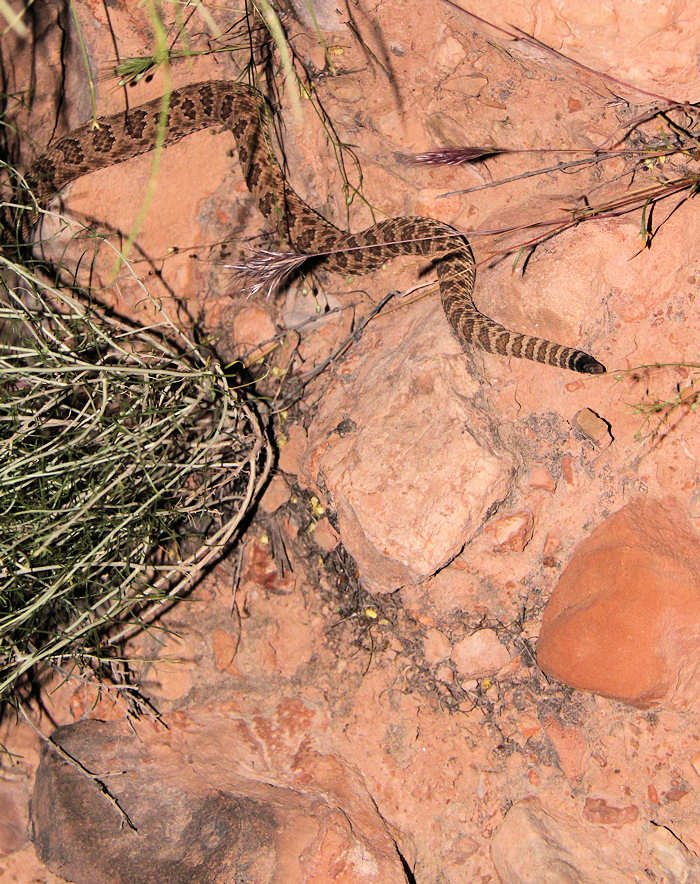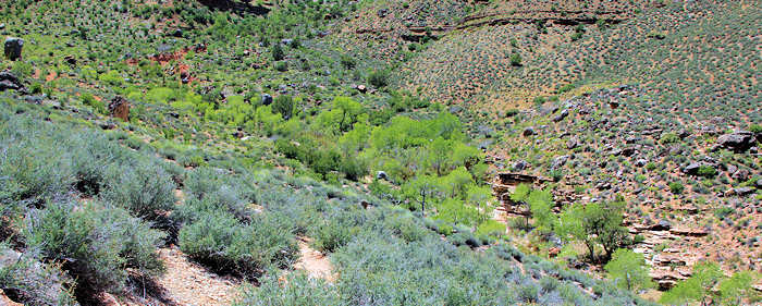 Nach ca. einer Meile endet dieser Abschnitt und wir sind wieder “draußen“. Die Wash öffnet sich in die Breite und nichts erinnert mehr an die ersten Abschnitte. Wir folgen der Wash Kurve für Kurve, wobei das nicht ganz richtig ist. Hin und wieder kürzen wir den Verlauf durch sog. „Cuts“ ab, wobei wir stets den Trampelpfaden folgen. Auf den letzten beiden Meilen gelangen wir mehrmals über etwas höher gelegene Plateaus, die in sattem Grün stehen, wie wir dies in dieser Gegend noch nie gesehen haben. Sicherlich mag das an der Jahreszeit und dem vorangegangenen Regen liegen aber ich vergleiche diese Formationen und Vegetation scherzweise fast mit Hochalmen. |