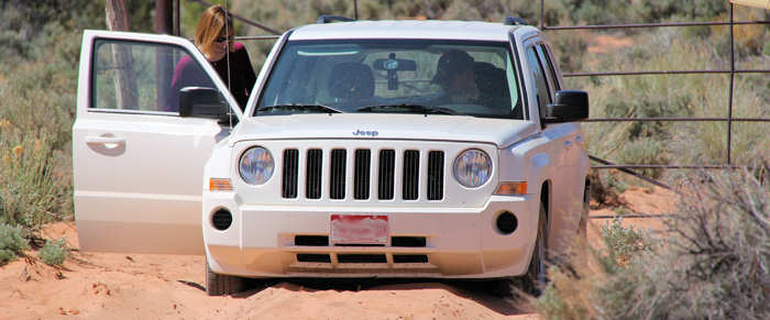 Nach kurzer Zeit geht es weiter und nach fast 1,5 Stunden erreichen wir den Trailhead zu den South Coyote Buttes, wo bereits ein Ehepaar an ihrem Pickup frühstückt. Die Strecke bis hier hin ist einfacher als gedacht, darf aber auch nicht unterschätzt werden: Es gibt einige sandige, sehr sandige und verdammt sandige Stellen. Wir sind mit unseren beiden Jeeps gut und ohne Gefahren durchgekommen, wobei wir einen 4x4-Jeep mit automatischem Allrad hatten. Allerdings ohne Sperren und ohne zusätzliche Geländeuntersetzung. Gunter und Stephi waren mit dem kleineren Jeep Patriot unterwegs, bei dem sich der Allrad manuell zuschalten lässt, was mir persönlich lieber gewesen wäre. Obwohl wir zum Glück keine Situationen hatten, in denen wir auf unser umfangreiches Überlebenskit hätten zugreifen müssen, ist der Wagen an einigen Stellen doch sehr ins Schwimmen gekommen bzw. der Wagen ist fast führerlos jeder tiefer eingefahrenen Spurrille im Sand nachgefahren. An mancher Passage hat der Wagen aufgesetzt, d.h. Differential oder andere abstehenden Teile am Unterboden der Fahrzeuge haben den höher liegenden Sand geplättet. Solange das nur Sand und kein Fels ist und solange die Räder immer noch genügend Grip haben, das Fahrzeug nach vorne zu bewegen, ist das alles zwar sehr aufregend und treibt das Adrenalin der Fahrer (Anita korrigiert mich: Und der Beifahrerinnen!) ziemlich in die Höhe, aber es bleibt ungefährlich. Trotzdem haben wir vier alle übereinstimmend gesagt, diese Tour mit einem Wagen allein nicht zu machen. Und ich bin mir sicher, dass ich an mindestens zwei oder drei Stellen umgekehrt wäre, wenn ich nicht ein Begeleitfahrzeug dabei gehabt hätte. Gerade die letzten 100 Meter vor dem Trailhead sind sehr sandig und gehen leicht bergab. Ich bin mal gespannt, wie wir und ob wir nachher wieder zurück kommen. Doch zurück zum Trailhead. Wir rüsten uns für den Hike auf. Mich fasziniert, mit wie wenig Gepäck die beiden anderen unterwegs sind. „Offensichtlich überlebt man hier auch ohne Expeditions-Equipment“ kommt es uns über die Lippen. Wir gehen in nord-westliche Richtung genau auf große und markante Buttes zu.