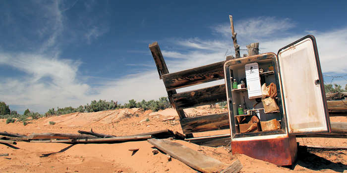 Es lohnt sich, für einige Fotos auszusteigen. Unser Interesse gilt insbesondere einem alten verrosteten Kühlschrank, der zu unserer großen Überraschung sogar noch gefüllt ist. Ein lohnenswertes Motiv. | |