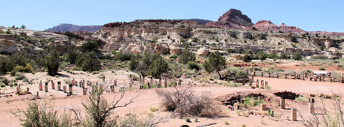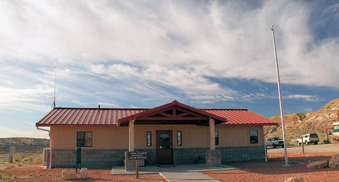 Und den dritten Zettel hinterlassen wir an der Infotafel an der Ranger-Station. Hier erkundigen wir uns beim Ranger nach den Wetterkonditionen für die nächsten zwei Tage sowie nach den Rahmenbedingungen für die beiden Touren, die wir in den nächsten Tagen vorhaben: Hike vom Buckskin Gulch Trailhead zum Wirepass und den Weg zu den Coyote Buttes South. War der Ranger zu Beginn unseres Gespräches eher zurückhaltend und fast schon etwas mürrisch, kommt er nun zunehmend auf Höchsttouren als er merkt, dass wir dieses Gebiet schon recht gut kennen und wir schon einige Touren hinter uns gebracht haben, insbesondere die fünftägige Tour vom Wirepass zu Lee´s Ferry. Er ist wie ausgewechselt und gibt uns eine ganze Reihe von Tipps, welche Hikes ebenfalls empfehlenswert sind. Unter anderem erklärt er uns, dass wir in diesem Gebiet fast überall wild campen dürfen und zeigt uns besondere Stellen. Wir beißen vor Wurt fast in die Tischplatte: Hätten wir das gewusst, hätten wir uns nichts zwangsläufig ein Motel suchen müssen sondern hätten, wie wir es immer wollen, wild mutterseelenallein die Nacht verbringen können. Aber das wissen wir nun für das nächste mal. Er beruhigt uns außerdem auf unsere Nachfrage hin, dass wir die Strecke zu den Coyote Buttes mit unserem Jeep gut schaffen können und gibt uns noch einige Tipps, wie wir in dem tiefen Sand fahren sollen. Angereichert mit viel neuem Wissen und einem beruhigten Gefühl geht es wieder zurück auf die 89. An der Abzweigung zur Houserock-Valley-Road vorbei verlassen wir die 89, um uns die Reste des Paria Movie Sets anzusehen. Nach 3 Meilen über die unpaved Road erreichen wir die Reste dieses Filmsets. Wir sind nun zum vierten Mal hier. Beim ersten Besuch Mitte der Neunziger konnten wir noch die originalen Gebäude des Paria Movie Sets kennen lernen. Sie dienten für den Film „Sergeants Three“ und auch in Fernsehserien wie „Gunsmoke“ . Ein zweiter Besuch scheiterte zunächst, weil die Gebäude einer Flashflood zum Opfer gefallen sind. Bei unserem nächsten Besuch sahen wir, wie die Gebäude von ehrenamtlicher Arbeit rekonstruiert wurden. Beim dritten Besuch im Jahre 2002 haben wir dann das Ergebnis dieser Arbeit gesehen und waren begeistert. Vor drei Jahren erfuhren wir dann von Marco, dass die Gebäude nun einer Brandstiftung zum Opfer gefallen sind und bei unserem heutigen Besuch erkennen wir nur noch die Fundamente. Ob es hier jemals wieder Gebäuden geben wird erscheint sehr fragwürdig und wir rätseln, weshalb es Menschen gibt, deren Drang nach Selbstverwirklichung darin besteht, zu zerstören.