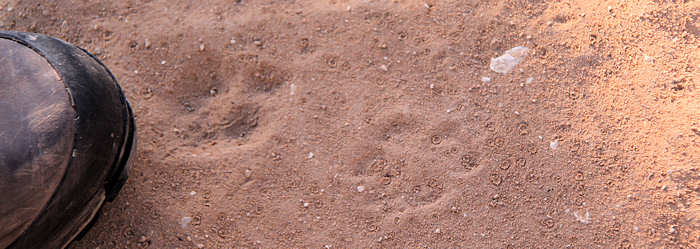 Außer uns Hikern gibt es auch noch eine Reihe anderer Lebewesen, wie man den hochinteressanten Spuren entnehmen kann. Wir wissen zwar nicht genau, welches Tier unseren Weg gekreuzt hat, auf jeden Fall ist es eine Katze, z.B. ein Luchs oder ein Puma.. | |