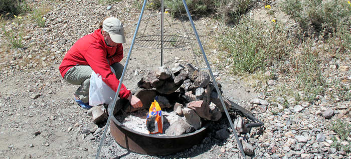 So bauen wir einen Feuerring aus Steinen und entzünden unsere Grillkohle. Ja, wenn das so einfach ginge. Bei der amerikanischen Grillkohle wird einfach die Verpackung angezündet und nach kurzer Zeit brennt Verpackung und Kohle lichterloh. Doch die Verpackung will nicht so wie wir bzw. auch die Grillkohle wehrt sich dagegen, ihrem Zweck nachzukommen. Evtl. liegt es daran, dass das Paket heute auf dem Stateline-Campground zu lange der Sonne ausgesetzt war und der Brandbeschleuniger, mit dem die Kohle und die Verpackung getränkt wurden, ist verflogen. Auch mein Zippo ist mittlerweile leer und so erweist sich das BBQ als schwierig. Der Wind lässt unsere Plastikteller umherfliegen und auch die Tischdecke kämpft ums Überleben. Dafür haben wir ja professionelle Tischklammern! Doch die nützen nichts, denn im Gegensatz zu den üblichen Picknicktischen auf Campsites passen sie nicht auf den gemauerten Tisch dieses Picknickplatzes. Nix funktioniert mehr wie früher und das ausgerechnet heute, wenn man Gäste geladen hat. Aus dem professionellen BBQ wird eher ein originelles: Mit viel Wedeln entfachen wir doch endlich mal das Feuer, Gunter ergänzt in akribischer Feinarbeit den Feuerring um einen Windschutz und ich befestige die Tischdecke mit Spanngurten. Trotz widriger Umstände wird uns, und hier spreche ich zumindest für Anita und mich, dieses BBQ in lebhafter und guter Erinnerung bleiben. Aber die untergehende Sonne macht einer gewissen Kühle Platz und wir beginnen alle vier zu frösteln. Alsbald packen wir das BBQ zusammen, bauen den Feuerring wieder zurück, verbuddeln die Kohle und fahren zurück. Unsere Wege trennen sich wieder für heute. Nach einem kurzen Tankstopp geht es zurück ins Motel. |