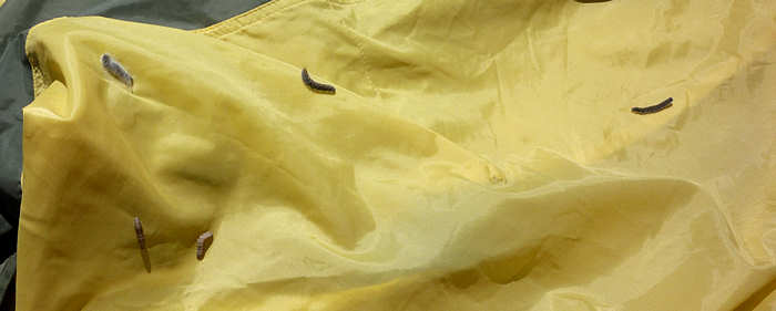 Doch er wird noch länger als gedacht. Denn die Raupen haben zugeschlagen. Anja und Micha berichteten, dass sie im letzten Jahr an dieser Stelle ebenfalls von einer Raupenplage heimgesucht wurden und jetzt verstehe ich, was sie meinten. Überall auf dem Zelt und in jeder Ecke raupt es sich vor sich hin. Lediglich die Schlafkabine ist raupenfrei, was sicherlich mit dem akribischen Verschließen zu tun hat. Es ist nicht nur etwas ekelhaft, viel problematischer ist es, dass sie gerade dabei sind, sich zu verpuppen. Dabei entwickeln sie u.M. nach ein ätzendes Sekret, was auf dem Zelt nicht nur unschöne Flecken hinterlässt sondern sogar Schäden verursachen kann. Also inspizieren wir jede Ecke des Zeltes auf das Genaueste und entdecken die Biester sogar an Stellen, die wir nicht für möglich gehalten haben. Alle Kanäle für das Zeltgestänge sind kontaminiert und so sitzen wir vor dem Zelt und versuchen die Raupen im Lichte unserer Stirnleuchten mit Zeltheringen aus den Kanälen zu ziehen. Eine gute Stunde geht dabei drauf, bis wir das Zelt (vermutlich) raupenfrei haben. Nach einem letzten Schluck Kaffee decken wir das Feuer ab und uns im Schlafsack zu. So long, denn heute ist leider unsere letzte Nacht im Zelt für diesen Urlaub. |