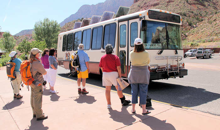 Nur nicht verschlafen und den Shuttle verpassen“ geht es uns seit gestern Abend durch den Kopf. Entsprechend unruhig ist die Nacht und wir sind um 4.30 Uhr noch vor den Weckern wach. Um 5.45 Uhr sind wir mit dem Auto in Springdale, wo wir für einen Aufwach-Kaffee im Service-Paradies Amerika vergebens eine geöffnete Tankstelle suchen. Pünktlich um 6.30 Uhr fährt der Shuttle vor und nimmt uns auf. Zu unserer großen Überraschung fährt er sogleich los bis wir realisieren, dass wir heute erstmalig keine Mitfahrer im Shuttle haben werden.