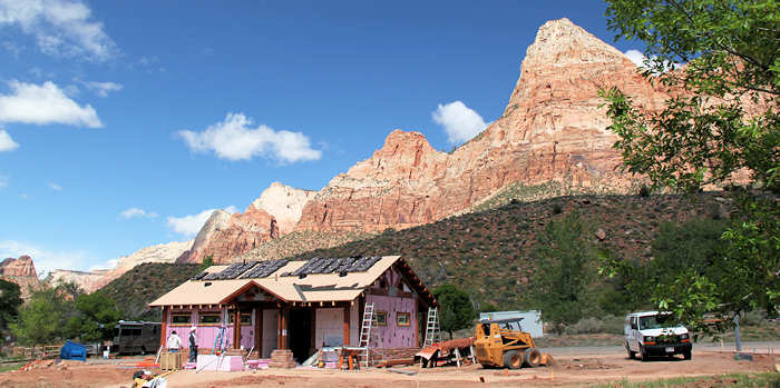 Welch böses Erwachen: Unmittelbart neben ihr entsteht gerade ein Häuschen, vermutlich eine Toilettenanlage. Der traumhafte Blick aus dem Zelt auf die Zinnen des Zion wird nun von einer Baustelle und später mal von einem Klo geschändet. Ich frage mich, was mir wichtiger ist: ein schöner Blick oder….. | |