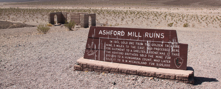 Bei den Ashford Mill Ruins halten wir abermals für ein paar Fotos an. Unter anderem „shooten“ wir für unsere Diashow unsere Wanderschuhe vor schönem Hintergrund – zur Überraschung einiger Passanten. Wir werden aber nicht angesprochen ! Zu den Ashford Mill Ruins gibt es bei uns ein nettes Anekdötchen. Nachdem wir schon sehr viel im Death Valley erkundet hatten, stießen wir auf einer Karte mal auf diese Ruinen, die unser Interesse weckten. Daraufhin sind wir den weiten Weg von weit über 100 Meilen gefahren um auf diese historisch sicherlich interessanten aber zum Erkunden eher nebensächlichen Ruinen stießen.